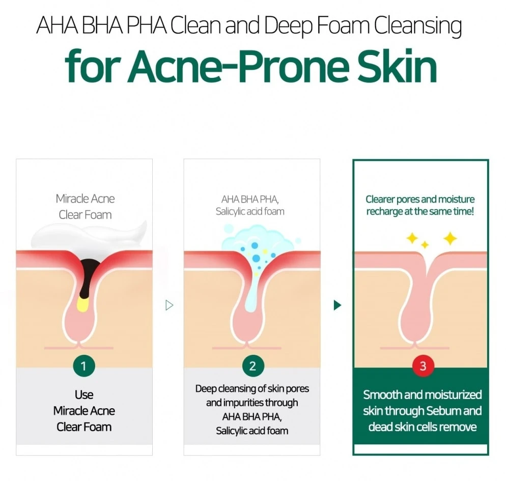 Use the SOME BY MI 30 Days Miracle Acne Clear Foam in your k beauty skincare routine in combination with the other SOME BY MI Miracle products to help achieve the best possible clarity for your skin.