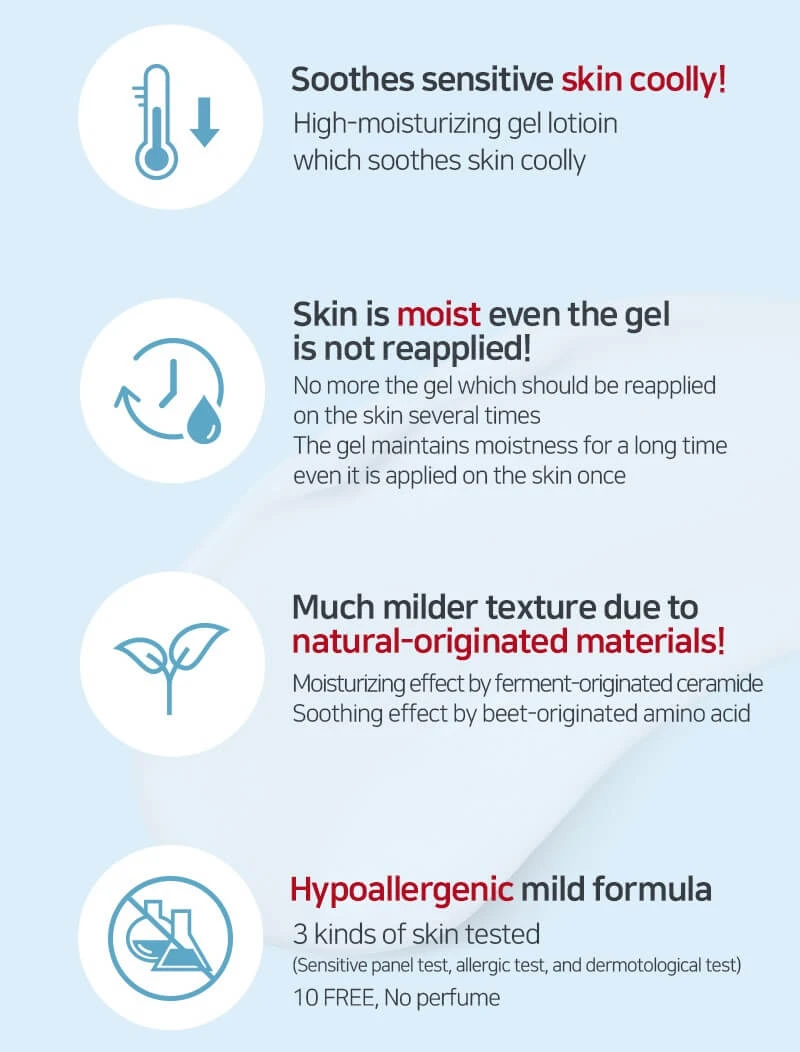It is enriched with fermented ceramide, providing instant and long-lasting skin hydration. The gel also contains amino acids from sugar beet to alleviate sensitive and irritated skin.