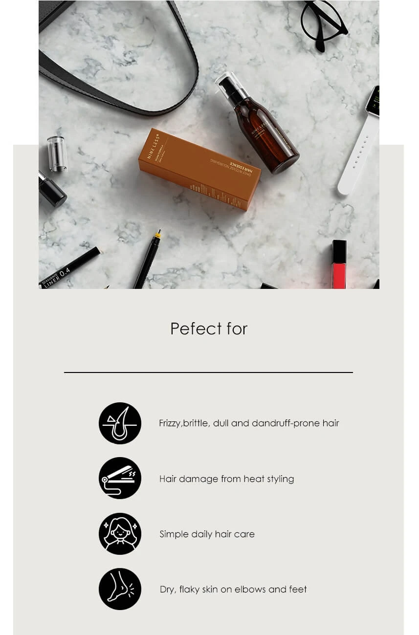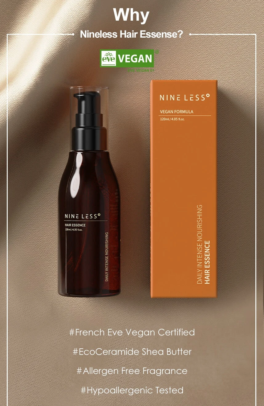 Use the NINE LESS Daily Intense Nourishing Hair Essence to protect weak hair, prevent hair loss, guard against heat damage, and to overall strengthen your hair for daily wear and tear.