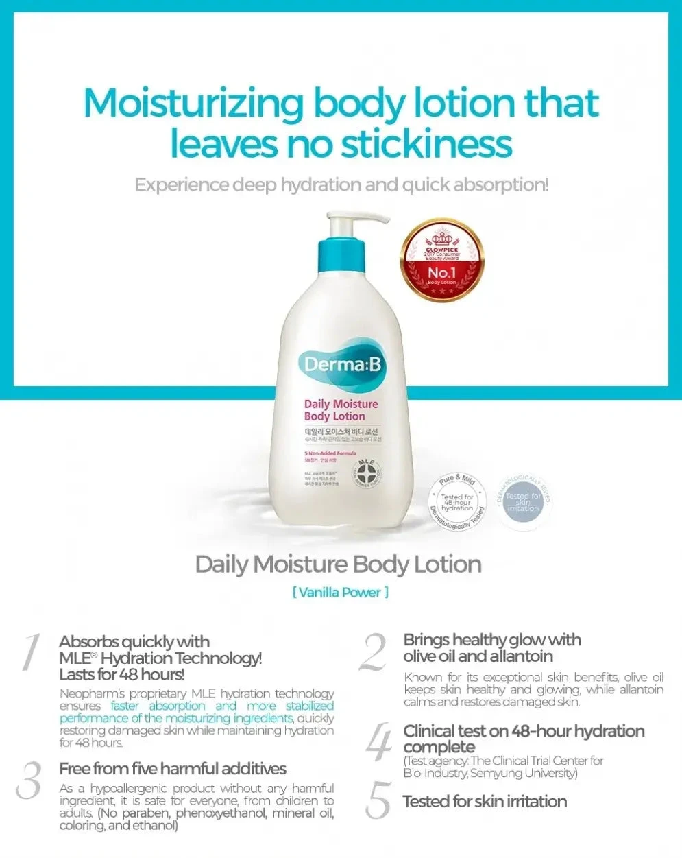 DERMA:B Daily Moisture Body Lotion will inspire you to love the skin you’re in. This skincare lotion is designed to deeply moisturise your skin, making it feel smooth and rejuvenated.