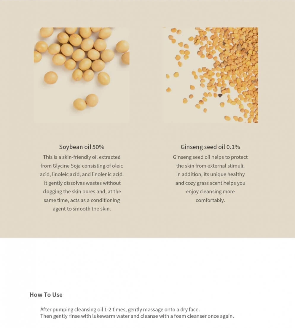 A K-beauty skincare cleanser formulated with 50% soybean oil and 0.1% Ginseng seed oil