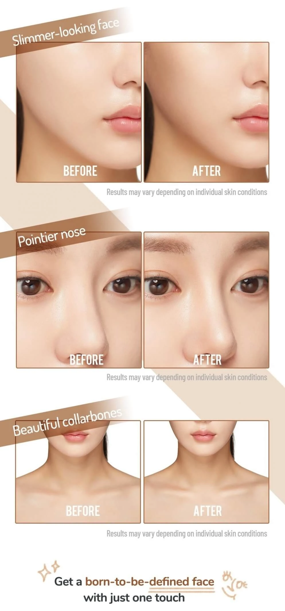 According to your skin tone, apply a single or 2 to 3 colours on the nose, chin, or other