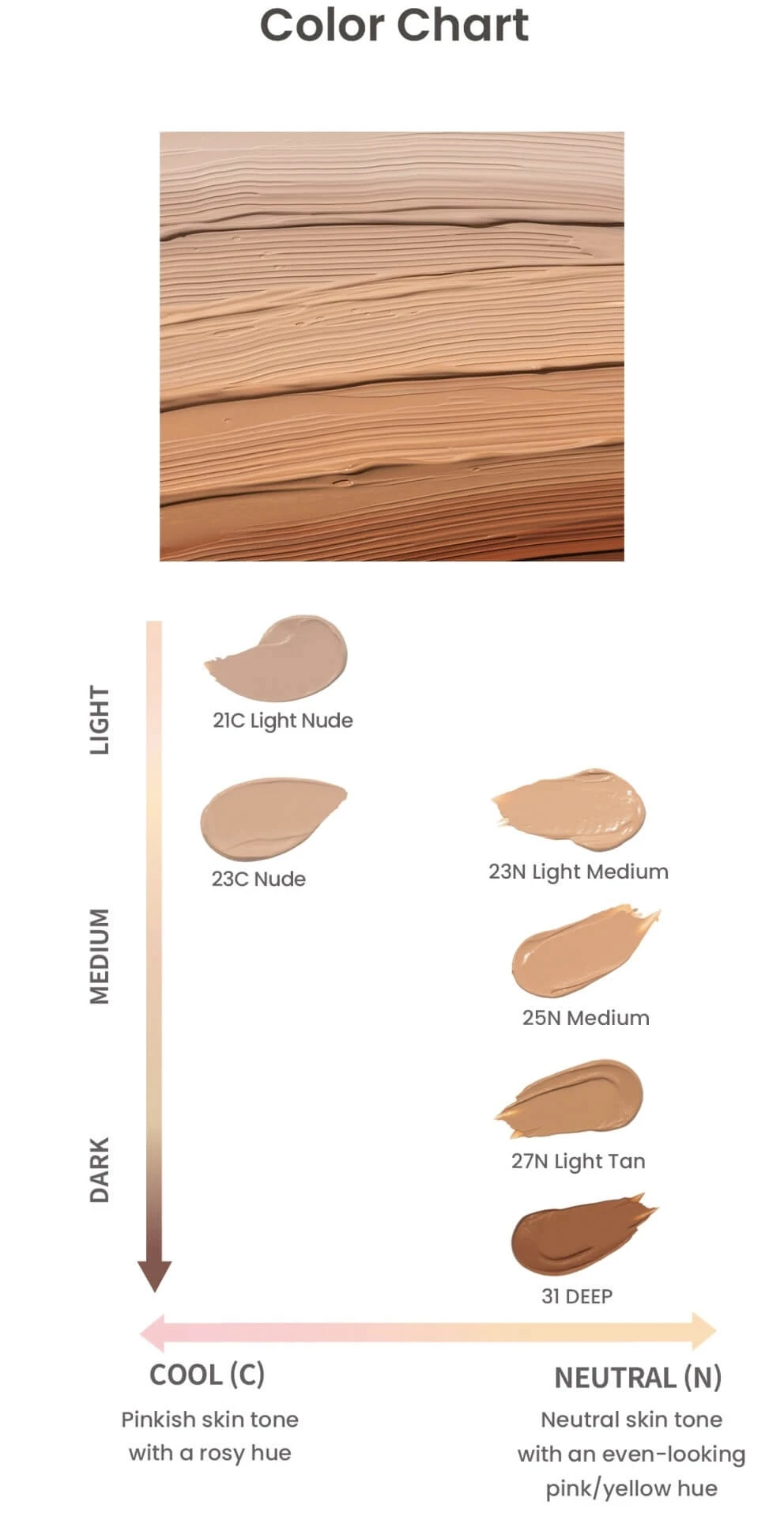 It comes in five tones: Light Nude, Nude, Light Medium, Medium, Light Tan, and
