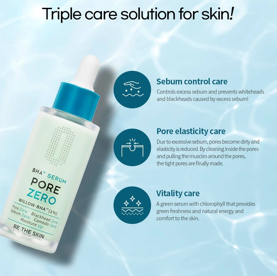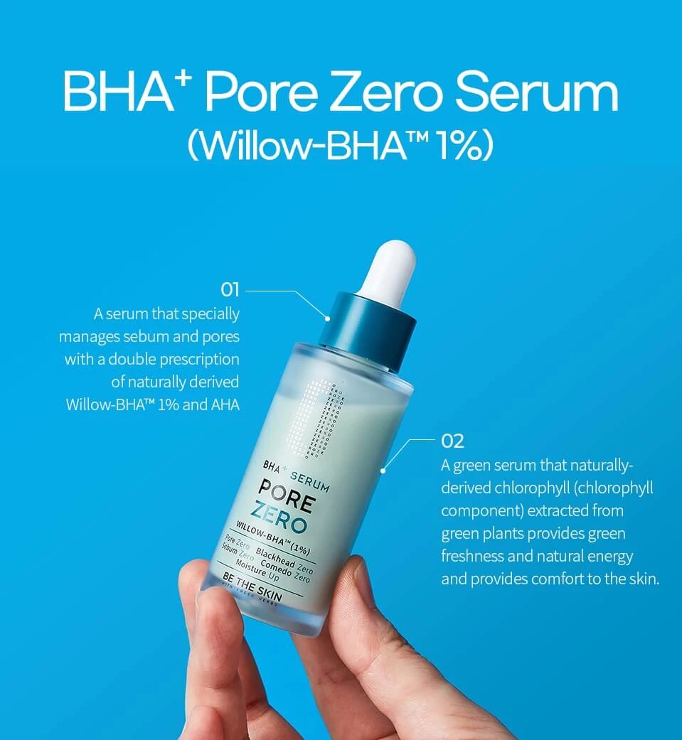 The Pore Zero BHA+ Serum by Be The Skin is formulated with 11% naturally-derived Willow BHA™ and AHA. This serum provides gentle yet effective pore care. And thanks to the natural energy of chlorophyll extract from green plants, you can enjoy fresh and rejuvenated skin.