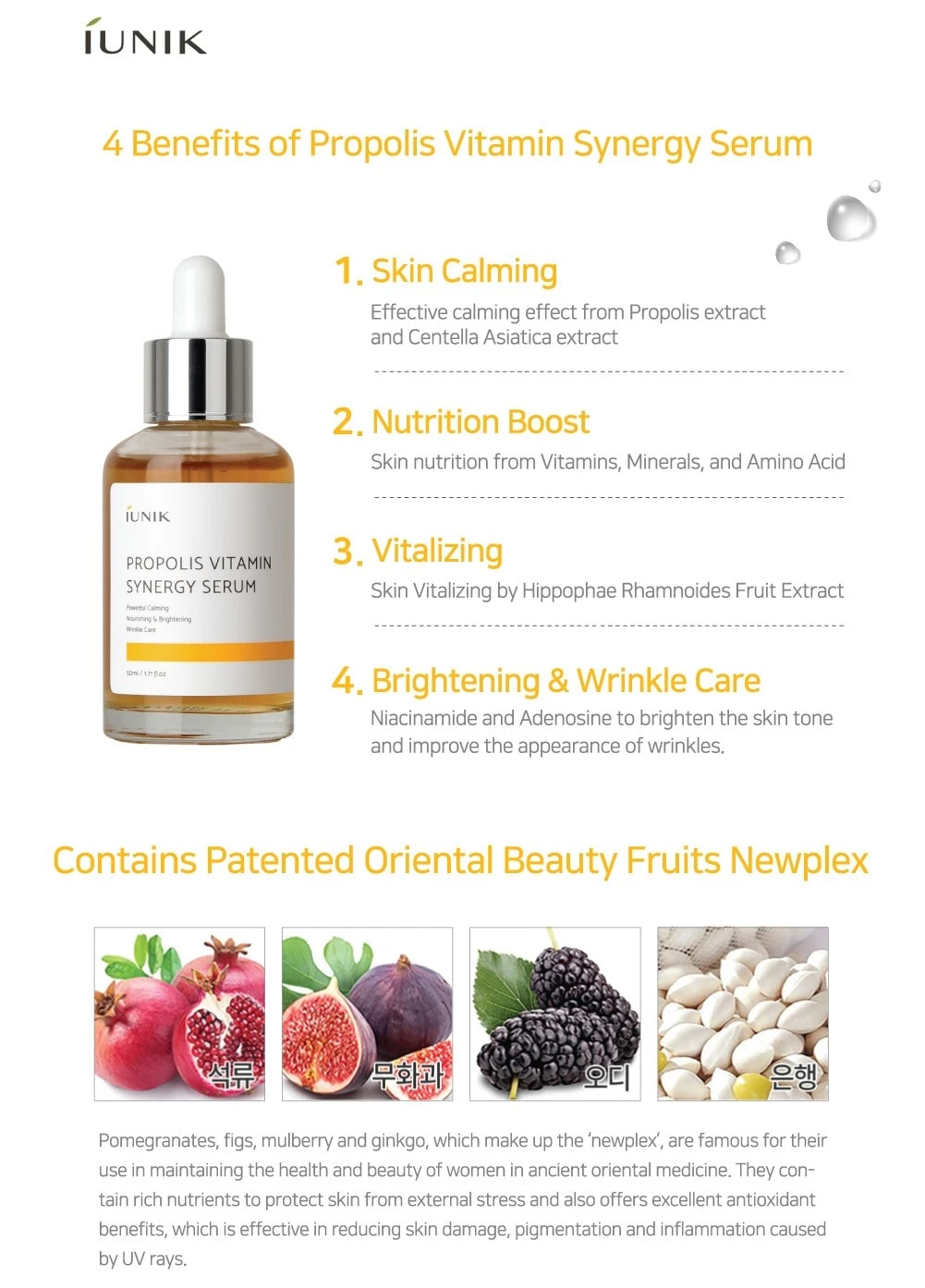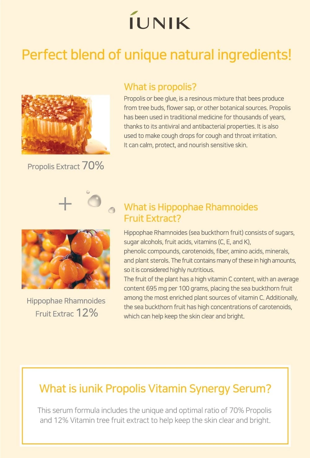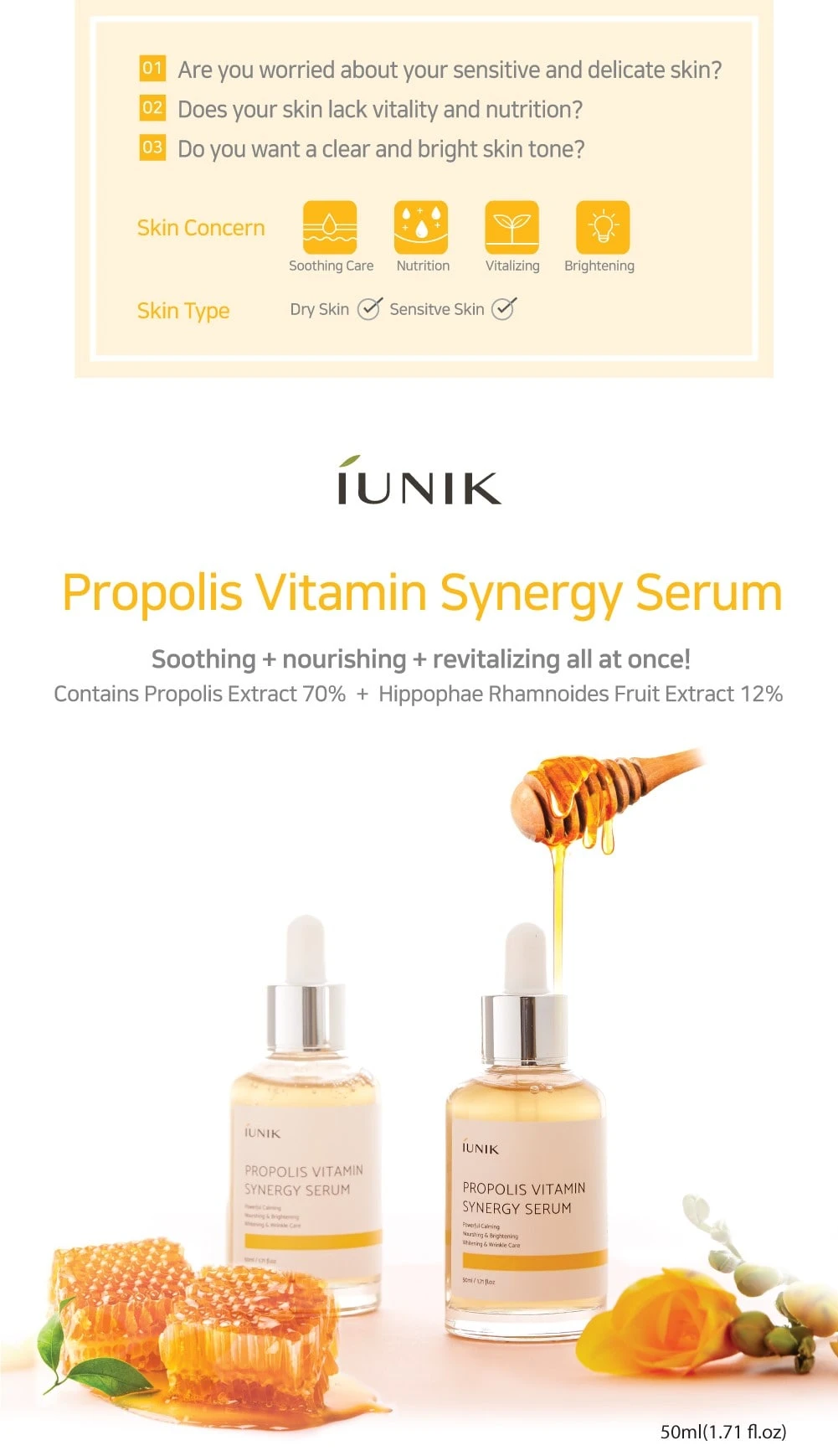 Rich in Vitamin C and other essential extracts, the iUNIK Propolis Vitamin Synergy Serum comprises a unique formula of 70% propolis (bee glue) and 12% sea buckthorn, producing a calming and brightening effect on sensitive skin. This soothing result is further enhanced with the use of carefully chosen extracts, including Centalla, purslane, witch hazel and ginkgo. Together, these natural ingredients soothe, nourish and revitalise, simultaneously.