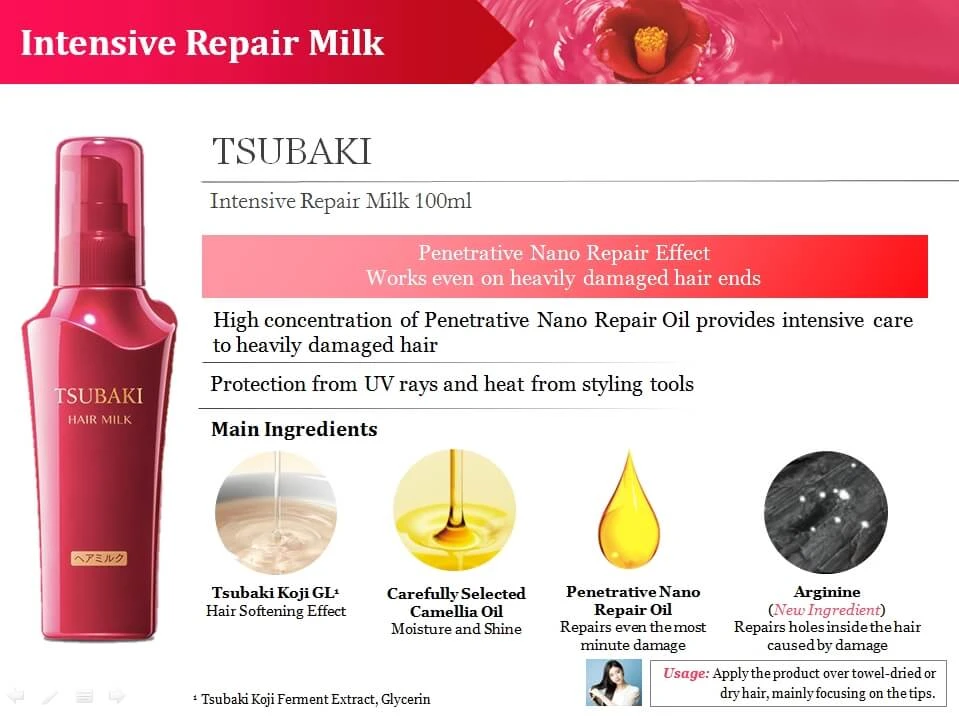 The Shieseido Tsubaki Hair Milk will repair the holes inside your hair caused by various harm like heat or dryness. It helps lock in moisture, promoting smoother hair and protecting it against UV-ray damage and heat damage from styling tools.