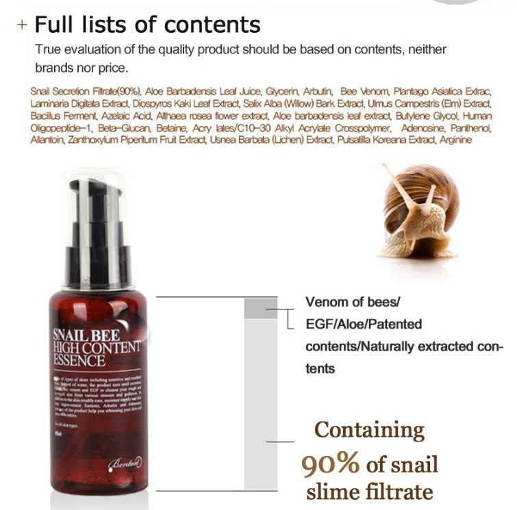Aqua (Water), Snail Secretion Filtrate, Butylene Glycol, Glycerin, Niacinamide, 1,2-Hexanediol, Aloe Barbadensis Leaf Juice, sh-Oligopeptide-1, Bee Venom, Plantago Asiatica Extract, Laminaria Digitata Extract, Diospyros Kaki Leaf Extract, Salix Alba (Willow) Bark Extract, Ulmus Campestris (Elm) Bark Extract, Althaea Rosea Root Extract, Aloe Barbadensis Leaf Extract, Beta-Glucan, Betaine, Acrylates/C10-30 Alkyl Acrylate Crosspolymer, Adenosine, Panthenol, Allantoin, Pentylene Glycol, Zanthoxylum Piperitum Fruit Extract, Pulsatilla Koreana Extract, Usnea Barbata (Lichen) Extract, Polysorbate 20, Lecithin, Arginine