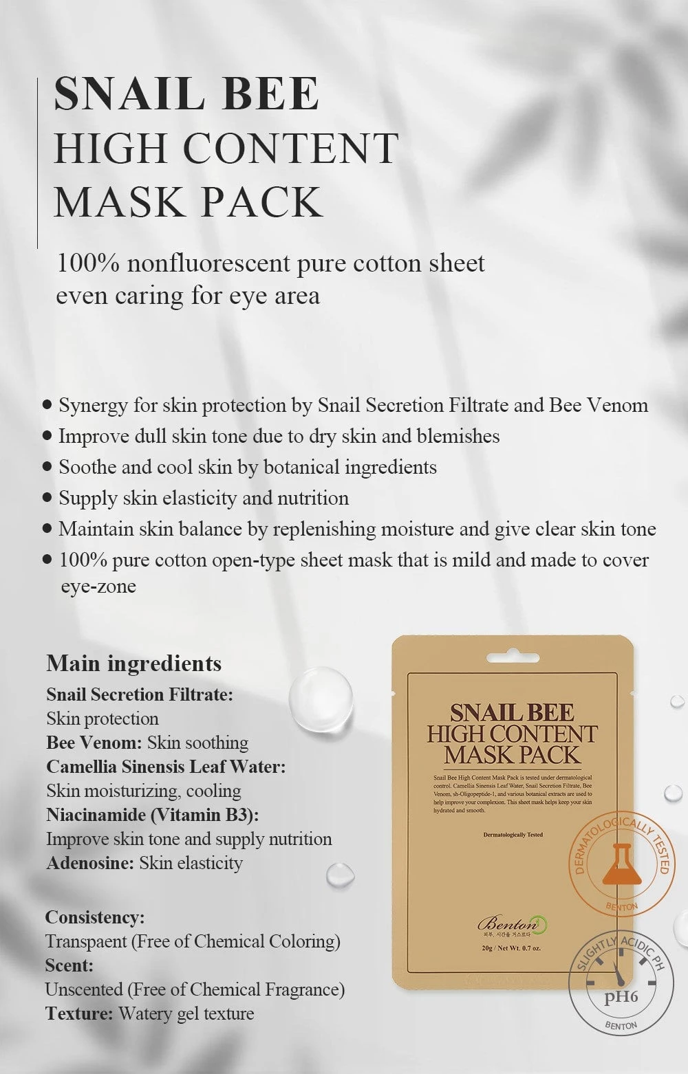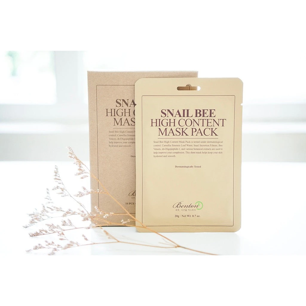 The Benton Snail Bee Mask has a very unique k beauty formula, comprising snail filtrate, bee venom, camellia leaf water, EGF, and hollyhock roots. These ingredients are incorporated to help reduce the appearance of wrinkles, whiten your complexion, and soothe your skin.