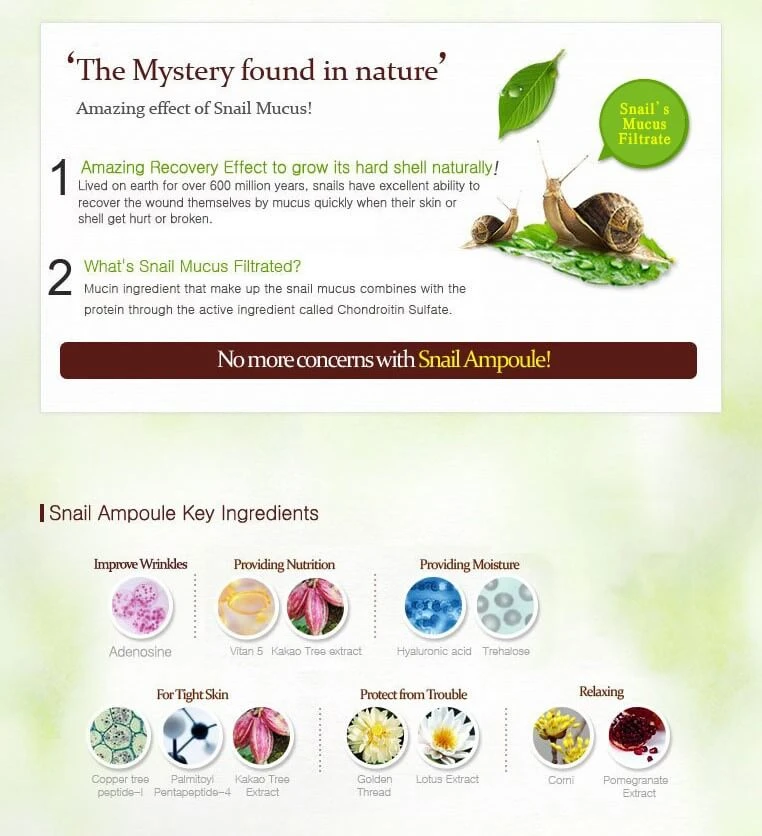 Snail Secretion Filtrate, Sodium Hyaluronate, Butylene Glycol, Glycerin, Ethanol, Panthenol, Glycereth-26, Punica Granatum Extract, Theobroma Cacao (Cocoa) Extract, Carbomer, Triethanolamine, Trehalose, Copper Tripeptide-1, Human Oligopeptide-1, Palmitoyl Pentapeptide-4, Cornus Officinalis Fruit Extract, Nelumbium Speciosum Flower Extract, Caprylyl Glycol, Ethylhexylglycerin, Tropolone, Sodium Polyacrylate, Adenosine, Coptis Japonica Extract, Disodium EDTA