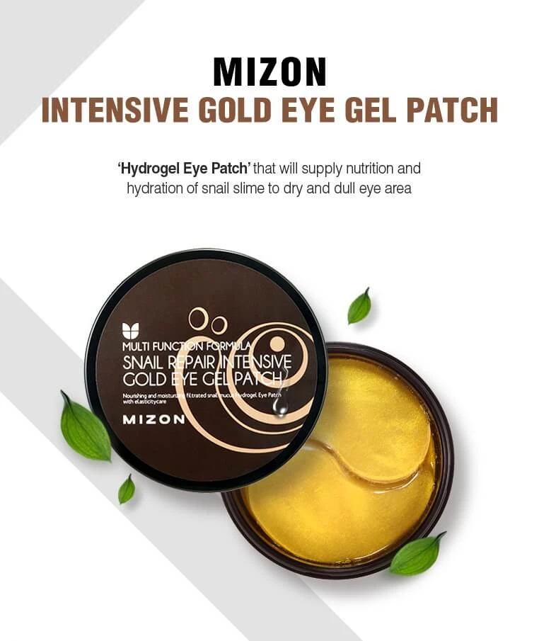 MIZON’s Snail Repair Intensive Gold Eye Gel Patch delivers hydration and nourishment of snail secretion filtrate to dry, dull skin around the eyes.