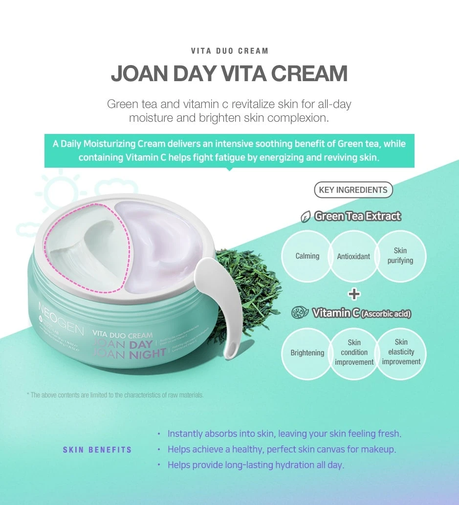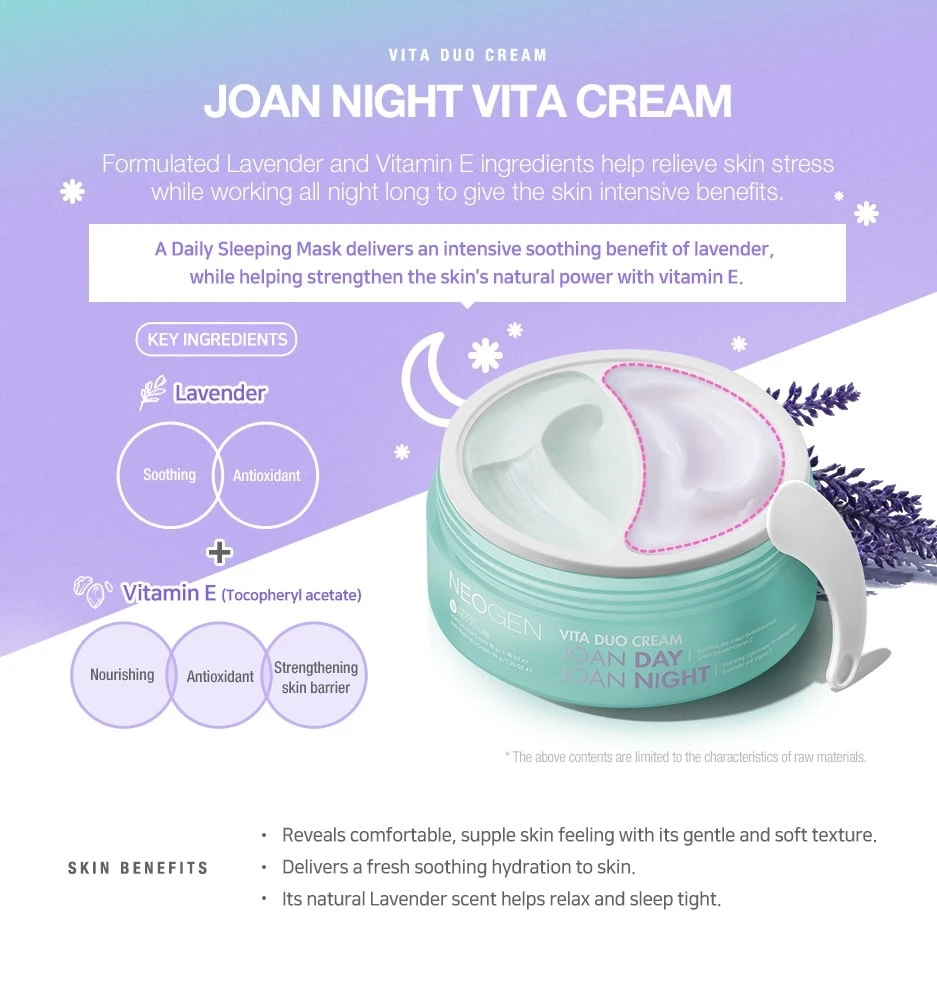 The NEOGEN Vita Duo Cream is a multipurpose cream for day and night skincare. The day cream is formulated with green tea extracts and Vitamin C to soothe, brighten, and nourish your skin, while the nighttime cream uses lavender extracts and Vitamin E to peacefully relax the skin from the day’s hardships.